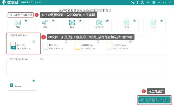 步骤1:下载并打开该软件,为了查找更全面,勾选全部的文件类型。dII文件一般是放在C盘里的,所以扫描路径直接选择C盘即可,点击“扫描”。