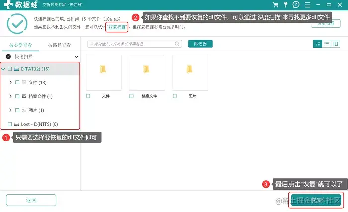 步骤2:快速扫描完成后,系统会找到相关的文件。这时,只需要选择要恢复的dII文件即可,如果你查找不到要恢复的dII文件,可以通过“深度扫描”来寻找更多dII文件(深度扫描需要花费更多时间来进行,请耐心等待一下),最后点击“恢复”就可以了。