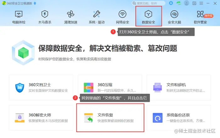 除了上面的两种方法,还有什么方法可以恢复丢失的dII文件吗?有的,如果你电脑里安装了360安全卫士,那通过360也能达到恢复的效果。打开360安全卫士界面,点击“数据安全”,找到里面的“文件恢复”,并且点击它。之后在弹出的搜索框里输入“dII文件”,找到缺失的dII文件,点击立即修复就可以了。