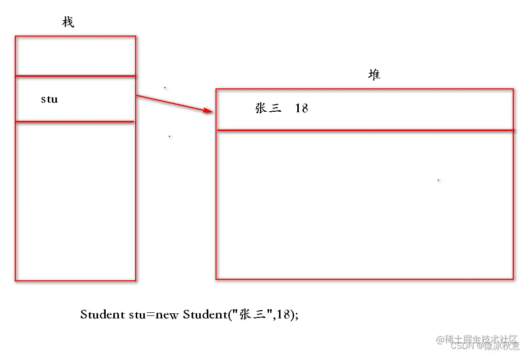 stu是栈中的引用,指向堆中的一个地址,在此例中该堆地址中的数据就是名字:张三,年龄:18