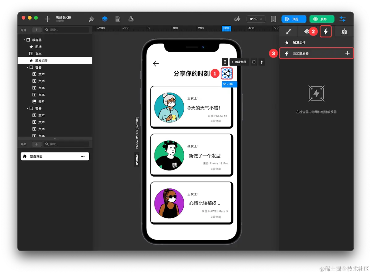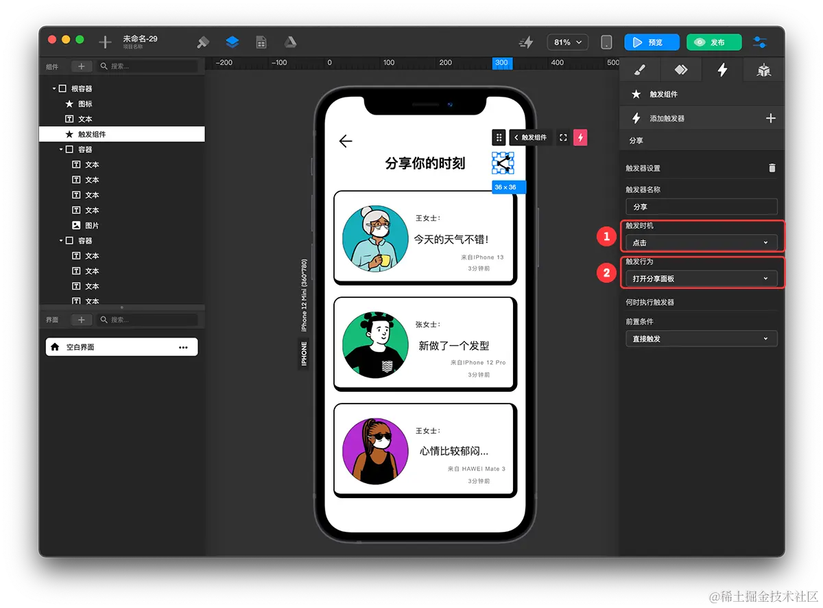 如何配置分享到微信功能? TOWIFY 2022-10-14 89 阅读1分钟 效果展示: 前置准备: 一个需要分享的 界面 一个需要触发分享的 组件(下文简称“ 触发组件 ”) 步骤分解: 创建触发器 选中触发组件 点击检查器面板的触发器图标 创建触发 配置触发器 触发时机 - 点击 触发行为 - 打开分享面板 这样就可以实现配置分享到微信功能里了。