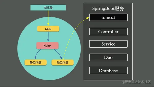 Nginx 根据资源的特性,会承担一部分动静分离的功能。其中,动态功能部分,会进入我们的 Spring Boot 服务。