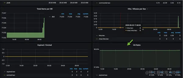 如图,我们通常使用 Grafana 进行监控数据的展示,使用 AlertManager 组件进行提前预警。这一部分的搭建工作不是我们的重点,感兴趣的同学可自行研究。下图便是一张典型的监控图,可以看到 Redis 的缓存命中率等情况。