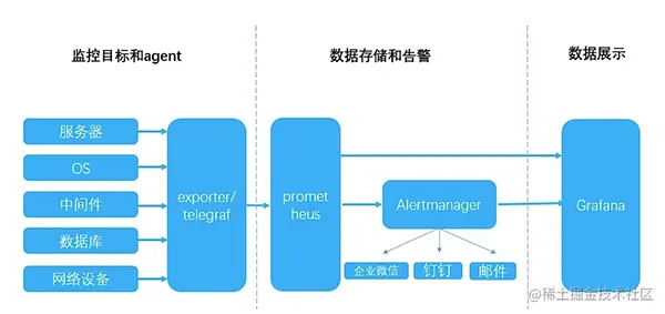 这里简单介绍一下流行的 Prometheus 监控体系。Prometheus 使用拉的方式获取监控数据,这个暴露数据的过程可以交给功能更加齐全的 telegraf 组件。
