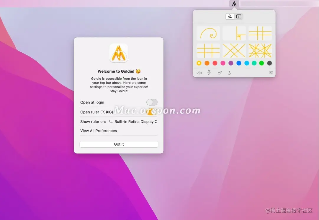 Goldie 位于顶部菜单栏中,可轻松打开和覆盖,或在任何程序中拖放 SVG 指南。明暗模式选项,以最适合您的眼睛。