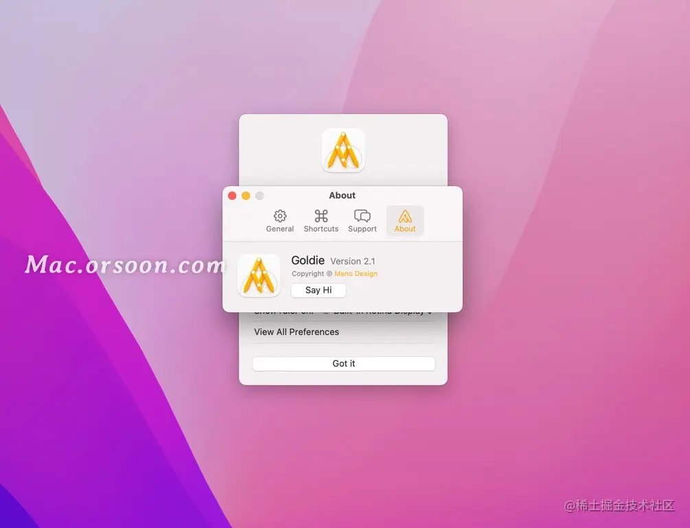 Goldie for Mac是一款运行在Mac平台上的黄金比例设计工具,Goldie mac版运行后显示在菜单栏,主要功能就是引用屏幕上任意两点之间的黄金比例,帮助用户根据黄金比例设计界面和图。Goldie for Mac版是一款很不错的黄金比例设计工具,Goldie mac版可以驻留在系统的菜单栏之上,随时提供给用户调用,独特的计算功能。