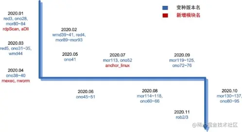 当 Emotet 不够活时,其下发的 mor 版 Trickbot 自然就会减少。这种情况发生在 2020 年年初, 当时 Emotet 偃旗息鼓,导致 Trickbot 通过 Emotet 传播的途径暂时中断。对于 mor 版 Trickbot,下图 显示了从 2019 年 11 月起的每月 mor 编号更新个数最低情况: