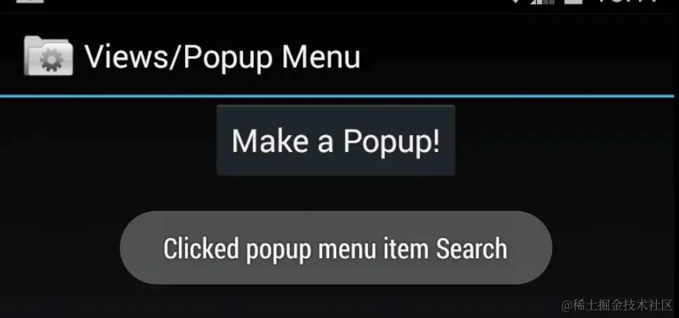 在模拟器中打开 API Demos 应用,依次点击 “Views”-“Popup Menu”-"Make a Popup"-"Search",查看页面 Toast 元素。