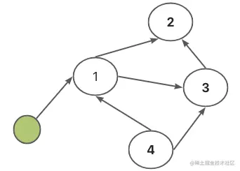 判断对象是否活动,主要通过指针方向来看。如下图,从跟对象出发,沿着指针方向向对象遍历,能遍历到的对象就是活动对象,不能遍历的则是非活动对象。下图中1、2、3都可遍历到,所以是活动对象,而4没有指针可到,因此4是非活动对象。