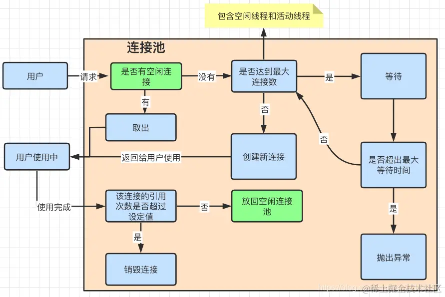 - 空闲连接池 : 已创建的连接池,当后端需要访问数据库时,先判断空闲连接池有无可用的连接,如果有,会从空闲连接池中取出一个连接,变为活动连接,用完后会放回空闲连接池