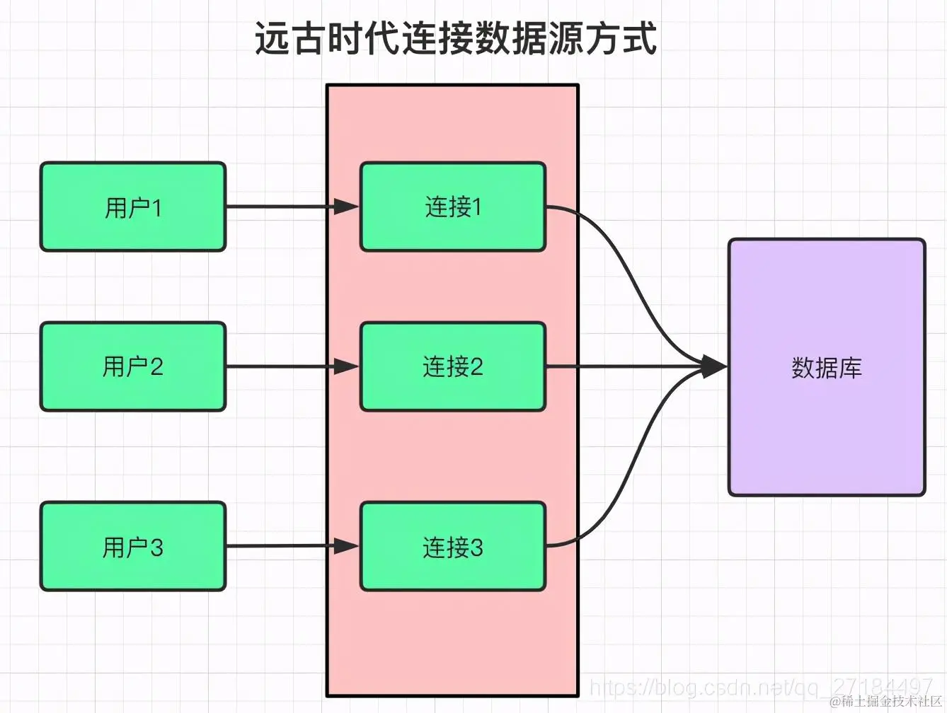 传统连接方式是每一个请求就使用去连接一次数据库,以mysql为例,当服务器收到请求时,服务器就会开启一个连接,连到数据库。