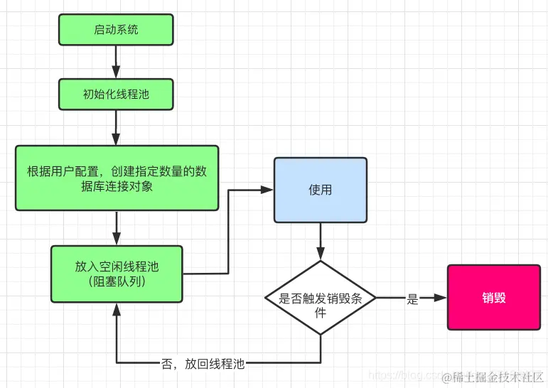 当客户请求数据库连接时,首先查看连接池中是否有空闲连接,如果存在空闲连接,则将连接分配给客户使用;如果没有空闲连接,则查看当前所开的连接数是否已经达到最大连接数,如果没达到就重新创建一个连接给请求的客户;如果达到就按设定的最大等待时间进行等待,如果超出最大等待时间,则抛出异常给客户。具体流程走向如下图