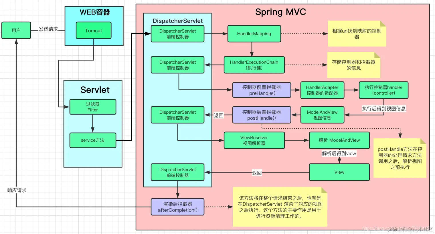 - 到这一步,DispatcherServlet就会调用ViewResolver(视图解析器)来解析ModelAndView 对象,得到一个View(视图),这个视图就是已经渲染好了的jsp页面了,然后把页面返回给前端之前再执行一次拦截器;