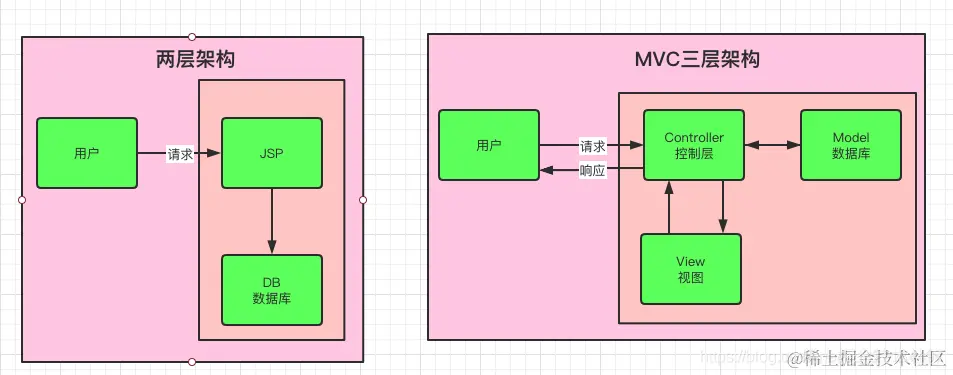 都知道叫做spring mvc,mvc是什么东东呢? 其实就是三层架构, 在过去架构都是两层的,就是浏览器通过servlet后直接访问JSP页面,也就是说所有的java代码都是在jsp页面里面写的,就连访问数据库也是在jsp页面,小型项目这样开发没什么问题,因为快嘛,但是大型项目是需要迭代的,是需要增加功能和模块的,你这么写的话,我后期维护起来很麻烦啊;而且java代码和html标签混搭,这样代码的可读性也不高;所以就衍生出了MVC三层架构