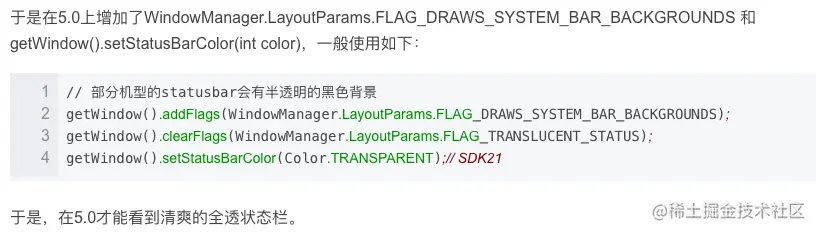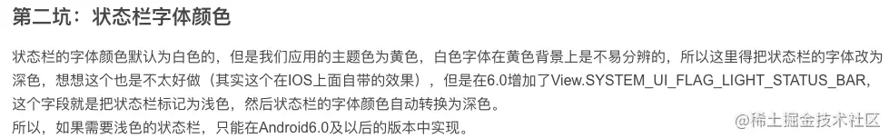 clearFlags(WindowManager.LayoutParams.FLAG_TRANSLUCENT_STATUS)必须跟setStatusBarColor(这个是在5.0及以上系统设置状态栏背景色的)一起使用 如果不设置setStatusBarColor 状态栏会没有沉浸式,同时状态栏设置了getWindow().getDecorView().setSystemUiVisibility(SYSTEM_UI_FLAG_LIGHT_STATUS_BAR);白底黑字也不生效