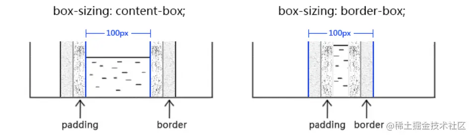 box-sizing的默认值是content-box,元素宽和高不包括padding和border。
