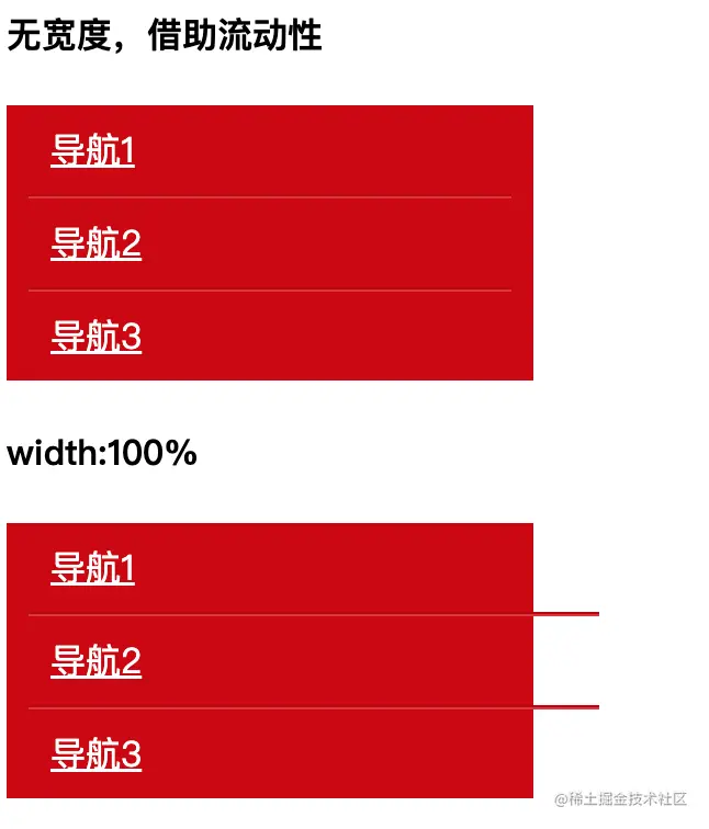 这种情况下设置宽度为100%是没有必要的,相反,设置了width:100%还会使得流动性丢失。如下例: