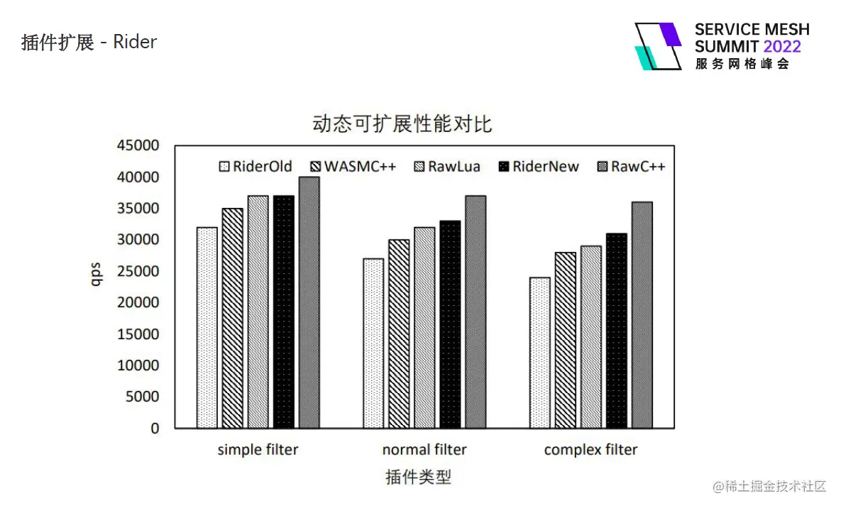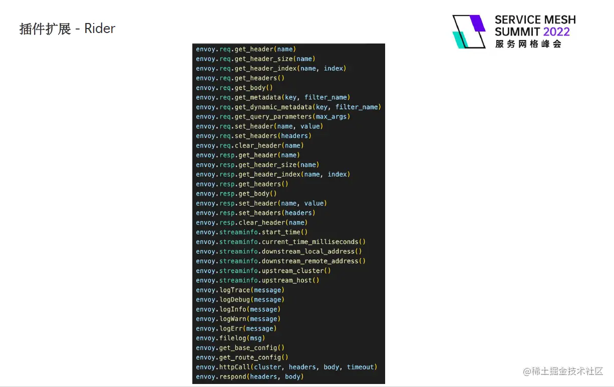 插件扩展的第二大类是我们的 Rider 的插件,Rider 比较像 Envoy 版本的 OpenResty,Envoy 本身有支持 Lua 的插件,但是它的支持比较简单,里面的 API 比较少,熟悉 OpenResty 的同学应该知道,我们写 Lua 和 OpenResty 是完全不一样的,因为 OpenResty 提供了很丰富的,跟网络操作、跟 Nginx 内部 API 做交互的 API,让我们很容易去做实际业务功能的开发,你无法想象我们纯粹用 Lua 去开发一个 HTTP_SERVER。基于这个背景,我们对 Lua 做了一个增强,在 Rider 插件提供了比较丰富的 Lua 交互的 API,让用户可以相对容易地在里面去实现一个上层的业务和治理的功能。另外,我们也对原生的 Lua 插件实现做了一些性能优化,相比来说 Rider 是有一定的性能优势的。