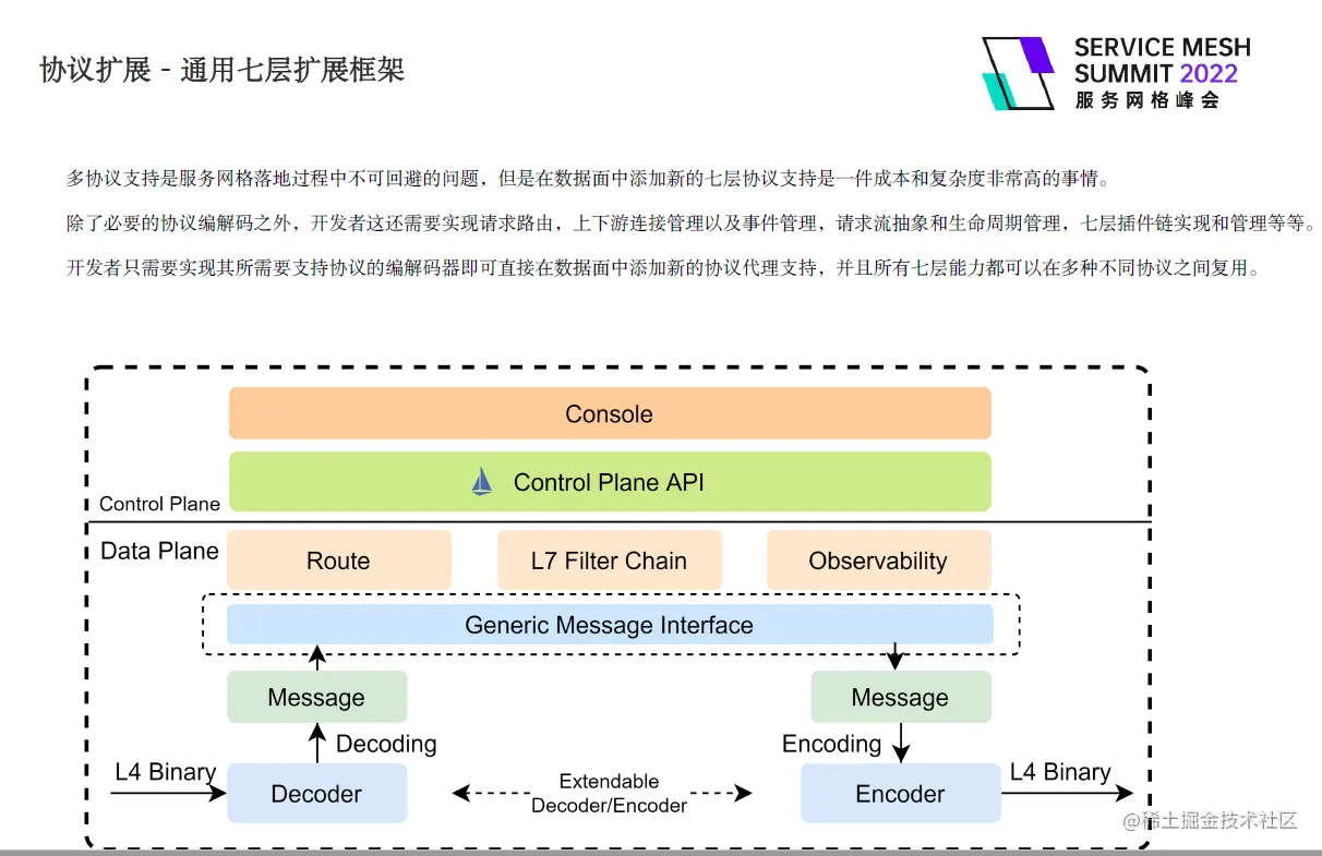 这里简要展开一下我个人对通用七层扩展框架的理解。我们服务网格多协议适配以及长期维护的成本很高,每接入一个新的协议,都需要去做一个额外的适配。在 Envoy 视角来说,支持一个新的协议需要做的事情,首先是对协议基本的编解码和协议流程的支持,这是协议内部的东西,肯定要做的;除此之外,还涉及到它要跟 Envoy 原有流程的对接,比如 Cluster 是不是可以用,路由是怎么生效的,流量的分派从 listener 进来怎么走到协议解析器或者是四层的 filter,也就是说,一个新的协议的支持要做很多重复性的事情,比如跟原有的机制相结合,这部分重复的工作量我们是可以省去的。
