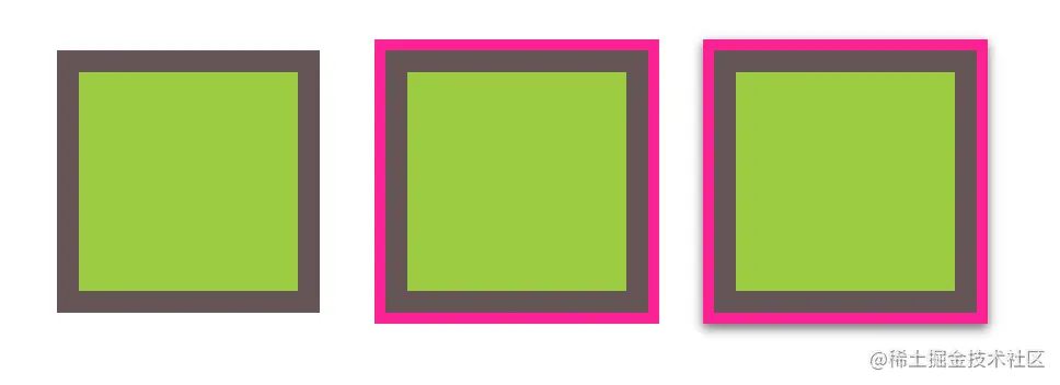 以上代码通过设置水平阴影和垂直阴影的偏移距离为0,以及模糊距离为0,设置扩张半径就可以模拟一道实现边框。不过box-shadow的好处在于,它支持逗号分隔语法,我们可以创建任意数量的投影。因此,我们可以非常轻松地在上面的示例中再加上一道deeppink颜色的“边框”。唯一需要注意的是,box-shadow是层层叠加的,第一层投影位于最顶层,依次类推。因此,你需要按此规律调整扩张半径。比如说,在前面的代码中,我们想在外圈再加一道5px的外框,那就需要指定扩张半径的值为15px(10px+5px)。