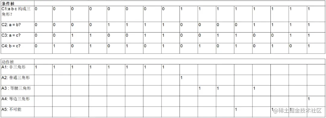 构成三角形的条件如果不满足的话,结果都是非三角形,和下面三个条件无关,这种情况下可以对判定表进行简化。