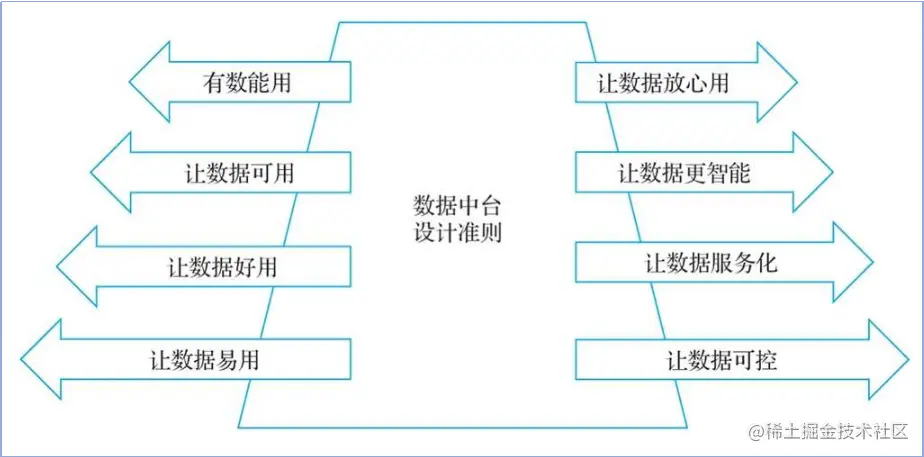 数据中台对外部体现的是公共的数据服务能力,赋能业务快速、敏捷、智能响应客户的需求。数据中台对内体现的是工具化和模块化的能力,提升数据工作者的效率。数据中台的核心是实现数据价值最大化,始终围绕着业务需要什么数据、业务需要什么能力、业务需要什么工具和平台、业务需要什么服务等。数据中台的8大设计原则如下图所示。