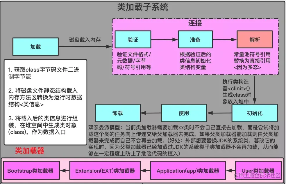 其实,Java 虚拟机将字节流转化为 Java 类的过程,就是我们常说的 Java 类的创建过程。这个过程可分为加载、链接以及初始化三大步骤: