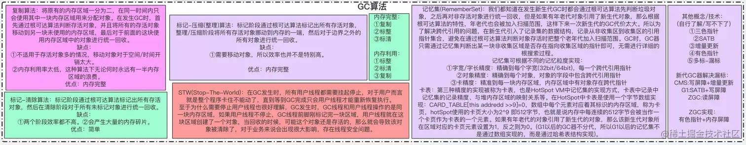 - 标记 - 清除算法 (Mark-Sweep): 最基础的垃圾回收算法,分为两个阶段,标注和清除。标记阶段标记出所有需要回收的对象,清除阶段回收被标记的对象所占用的空间。该算法最大的问题是内存碎片化严重,后续可能发生大对象不能找到可利用空间的问题。