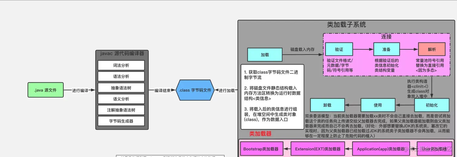 - 链接,是指将创建成的类合并至 Java 虚拟机中,使之能够执行的过程。链接还分验证、准备和解析三个阶段。其中,解析阶段为非必须的。