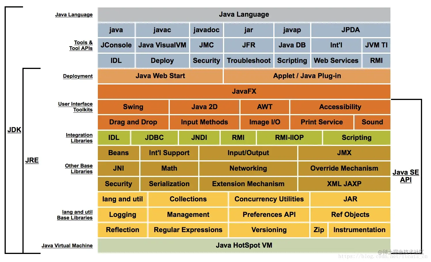 实际上,JRE 仅包含运行 Java 程序的必需组件,包括 Java 虚拟机以及 Java 核心类库等。我们 Java 程序员经常接触到的 JDK(Java 开发工具包)同样包含了 JRE,并且还附带了一系列开发、诊断工具。
