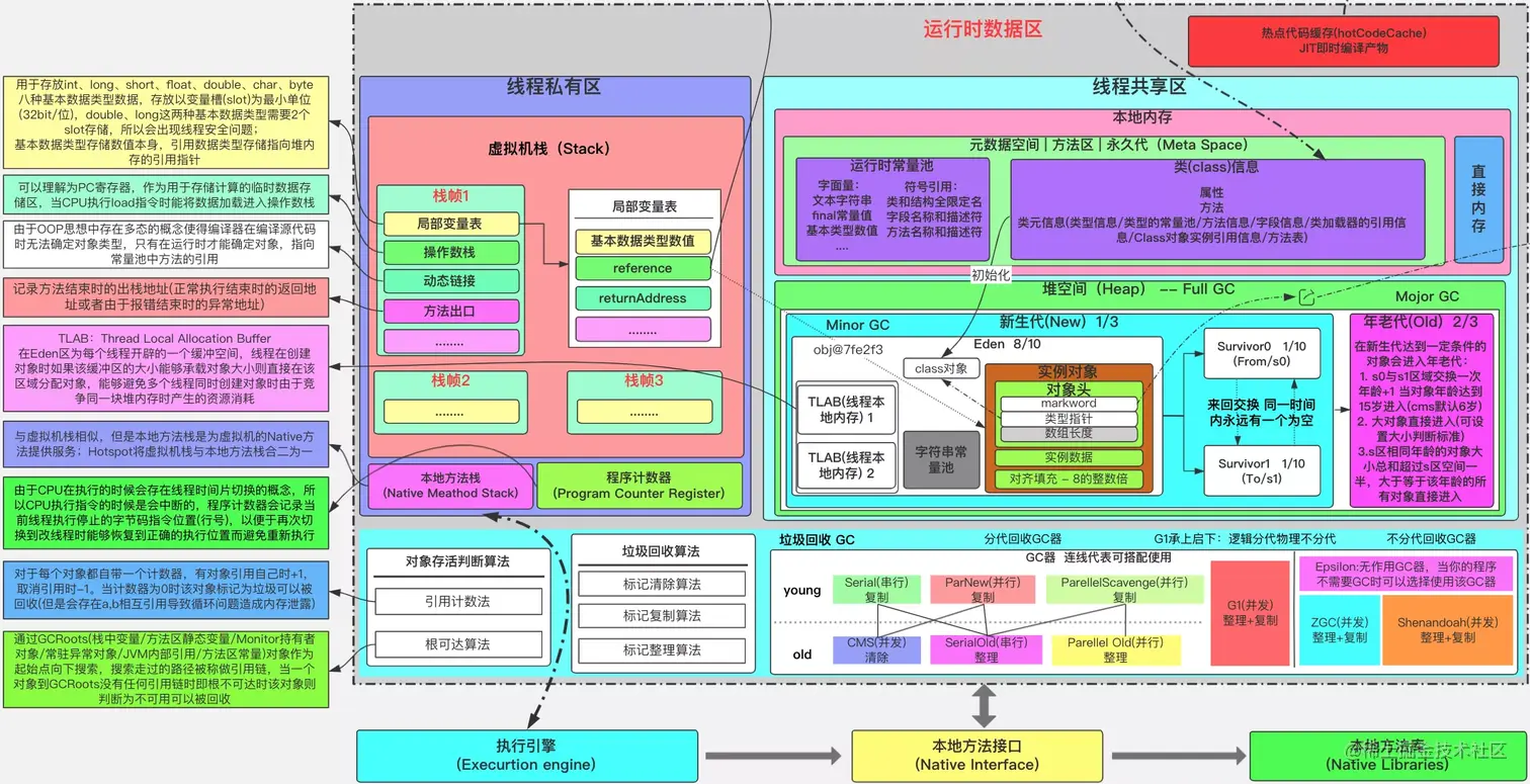 - Java 堆 (Java Heap): 是 Java 虚拟机 JVM 运行时数据区中,被线程共享的一块内存区域,创建的对象和数组都保存在 Java 堆内存中,也是垃圾收集器进行垃圾收集的最重要的内存区域。由于现代 VM 采用分代收集算法,因此 Java 堆从 GC 的角度还可以细分为:新生代 (Eden 区、From Survivor 区和 To Survivor 区) 和老年代。