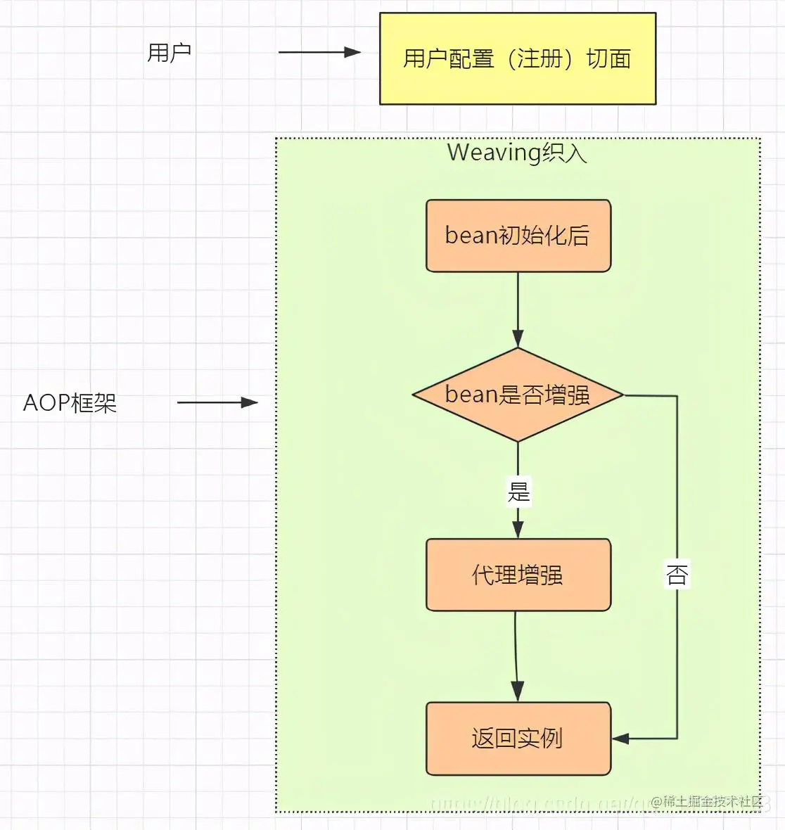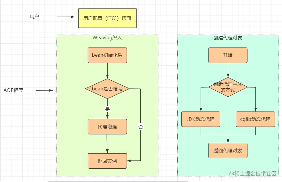 手写AOP的话,上面几个元素有的是需要用户提供的:Advice、Pointcut、Aspact,用户需要提供增强的功能和切入点、切面信息;AOP框架需要提供Join points、Weaving