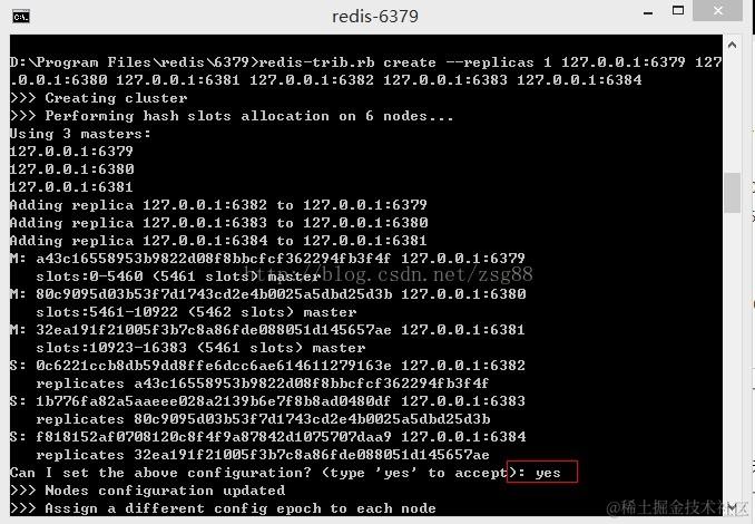D:\redis\6379>redis-trib.rb create --replicas 1 127.0.0.1:6379 127.0.0.1:6380 127.0.0.1:6381 127.0.0.1:6382 127.0.0.1:6383 127.0.0.1:6384