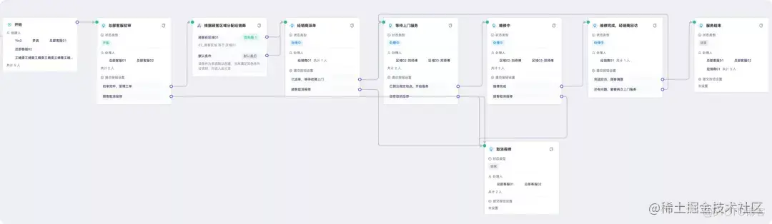 在某些工单系统的设置里,需要在这三个节点下不断重复设置取消报修的节点,但得益于自定义画布支持任意连线的功能设计,只需要设置一次,就可以多次复用某个节点,不仅灵活,而且高效。