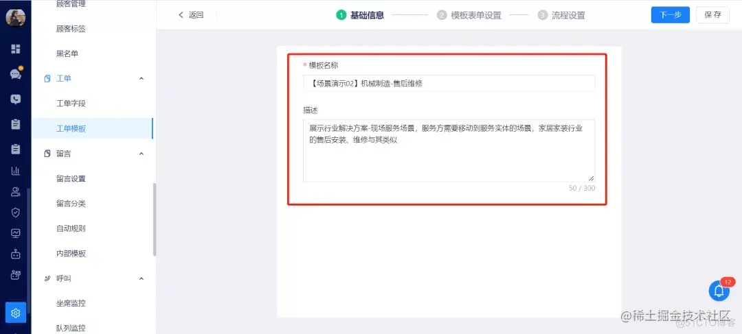 在理清售后维修流程中的每个环节、对象,及其之间的关系后,就可以进入工单的配置环节。以我们的工单系统为例,进行演示。首先要做一些简单的准备工作。比如,对工单的基础进行描述,包括名称、目的等等: