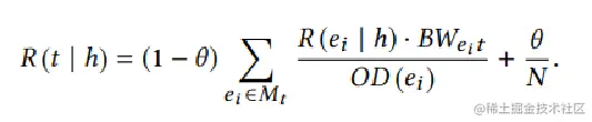 基于PageRank算法模拟资源流动直至分布稳定。尾部实体上的资源值为R(t|h)计算如下: