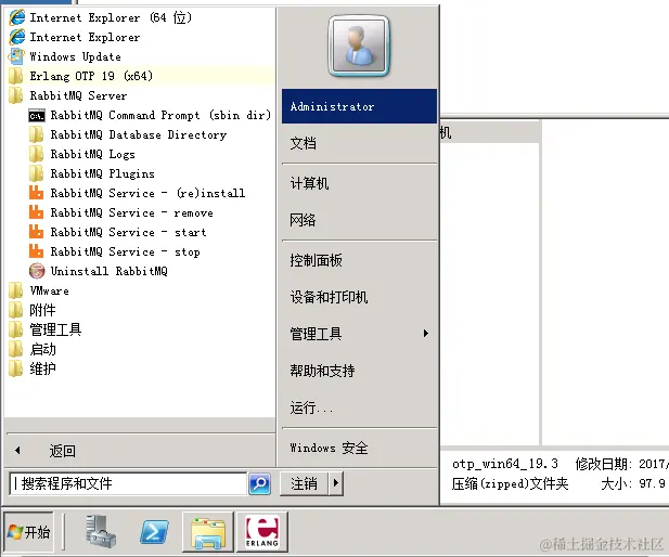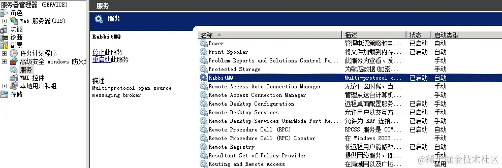 在开始菜单中,点击RabbitMQ Service Start开开启服务,可以到服务管理器中去确认是否开启成功。下图是当前机器上找到的相关服务,状态为已启动。