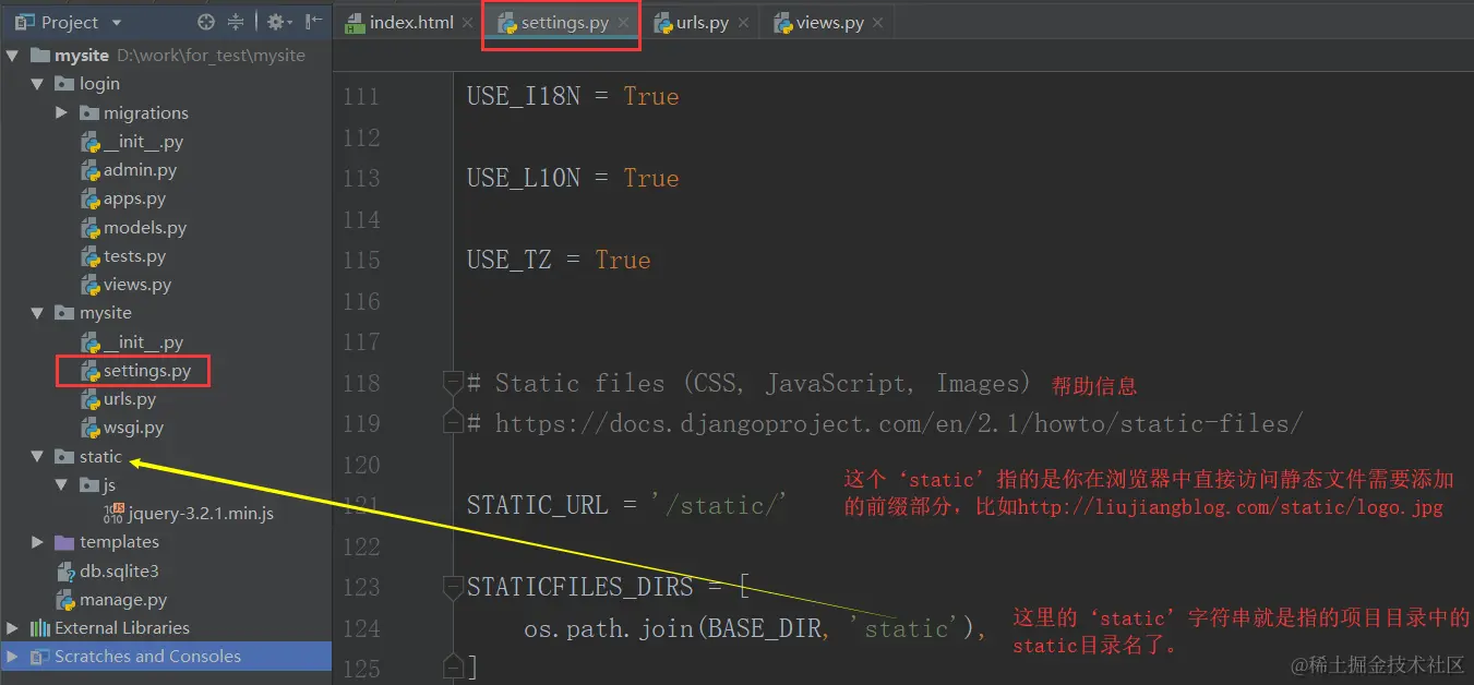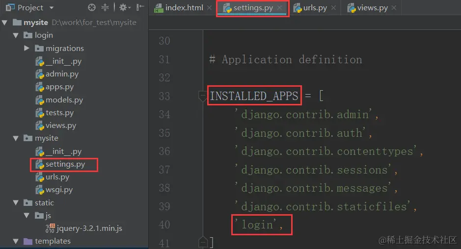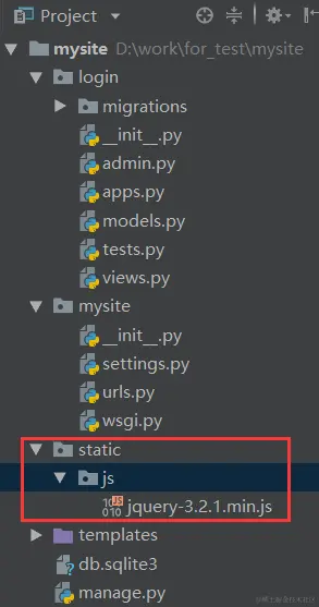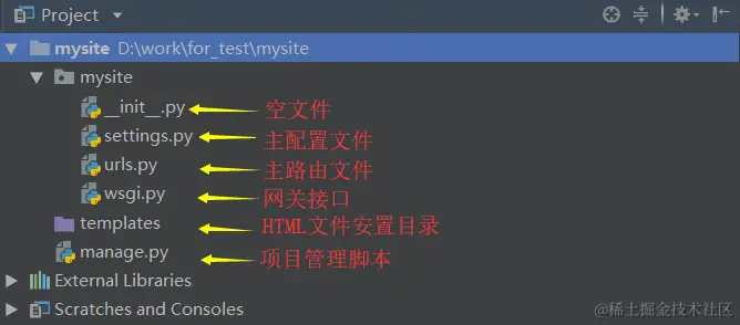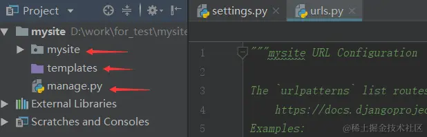 与项目同名的mysite目录中是项目核心文件。templates目录是HTML文件存放处(这是Pycharm安利给我们的),也就是MTV中的T。manage.py是Django项目管理文件。