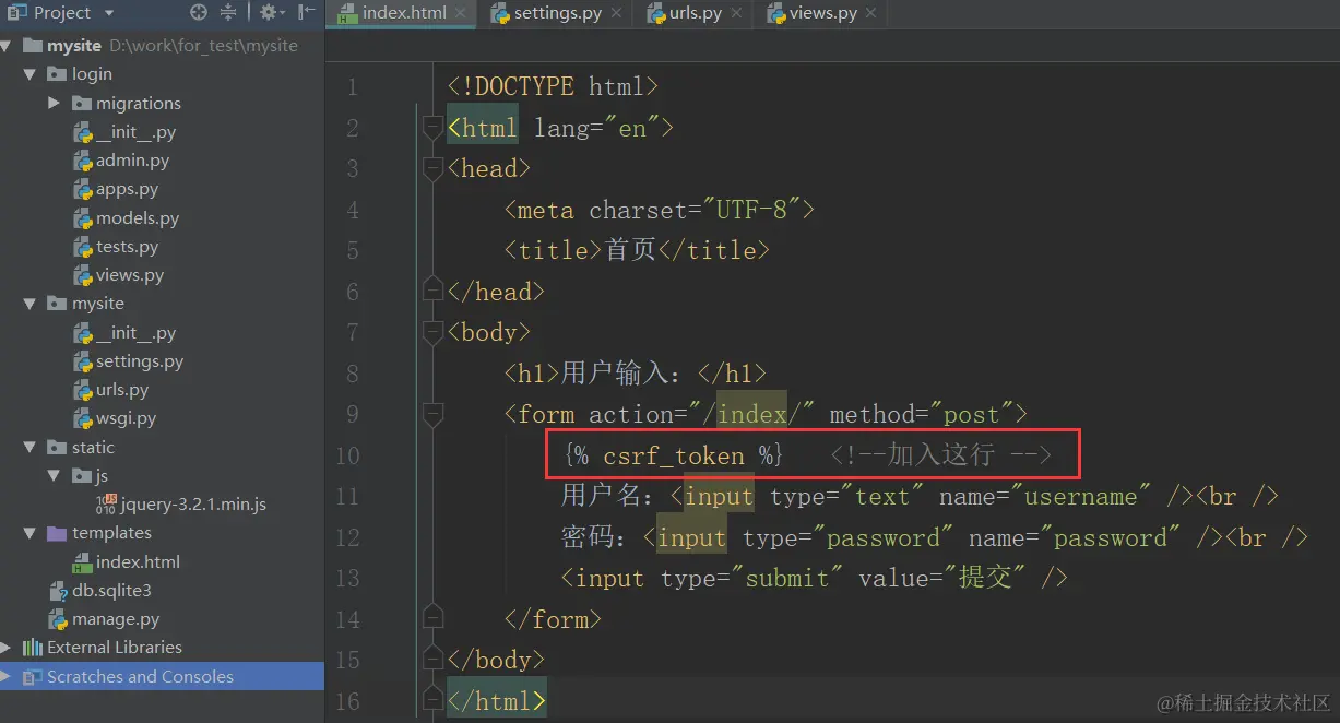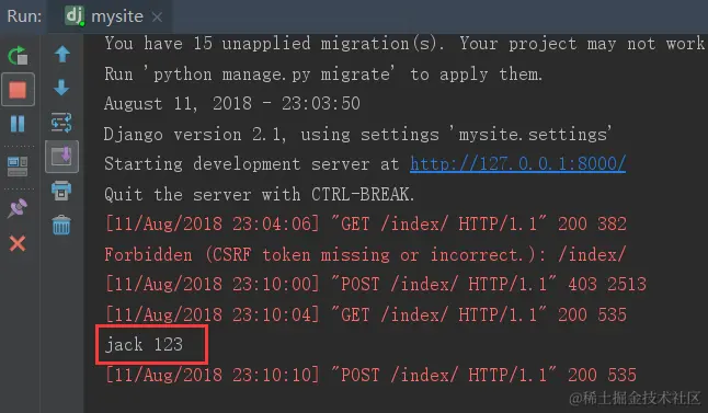 这是因为django有一个跨站请求保护机制,这需要我们在index.html文件中加入一行{% csrf_token %}。