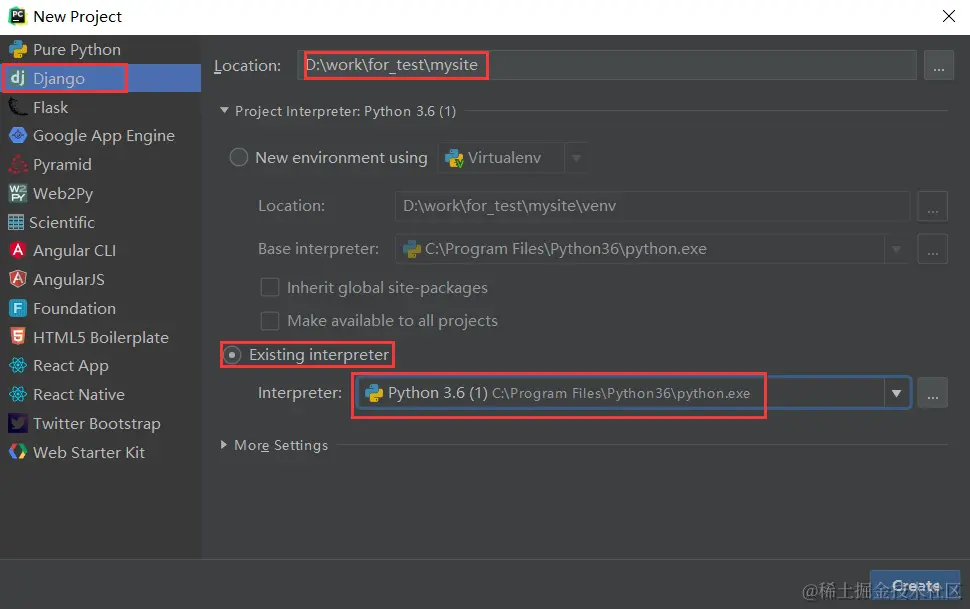 选择Django栏目,输入项目名称,这里采用国际惯例的mysite。选择先前安装好Django2.1的Python解释器版本,点击create创建。(注:这里暂不考虑虚拟环境问题)