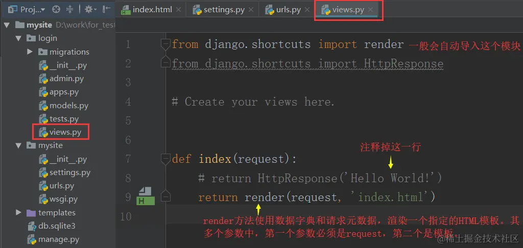 路由转发用户请求到视图函数。视图函数处理用户请求,也就是编写业务处理逻辑,一般都在views.py文件里。我们下面写一个简单的视图函数: