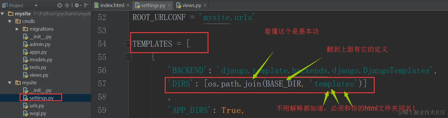 Django觉得MVC的字面意思很别扭,不太符合它的理念,就给它改了一下。view不再是HTML相关,而是主业务逻辑V了,相当于控制器。HTML被放在Templates中,称作模板T,于是MVC就变成了MTV。这其实就是一个文字游戏,和MVC本质上是一样的,换了个名字和叫法而已,换汤不换药。