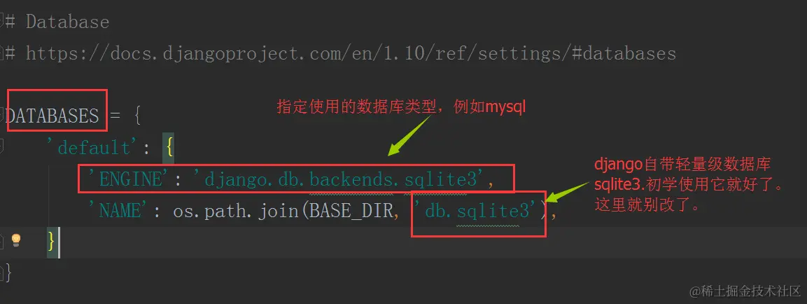 然后我们在settings中,配置数据库相关的参数,如果使用sqlite3,则不需要做任何修改。