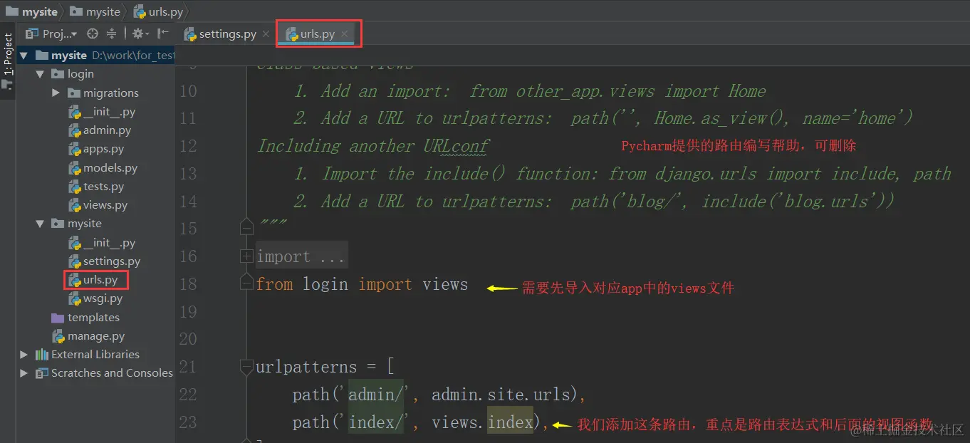 路由是浏览器输入url,在Django服务器响应url的转发中心。路由都写在urls文件里,它将浏览器输入的url映射到相应的业务处理逻辑也就是视图。简单的urls编写方法如下图: