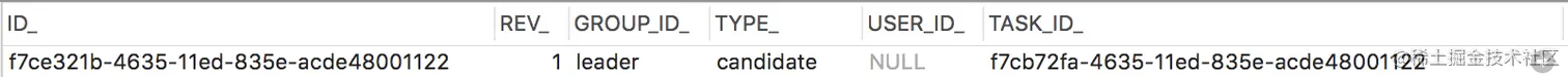 启动成功之后,我们可以在 ACT_RU_IDENTITYLINK 表中查看到用户组和 UserTask 之间的关系: