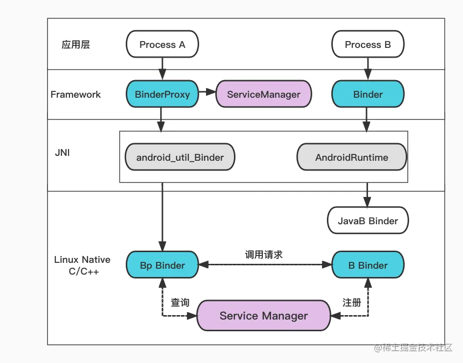 当 A 进程想要获取 B 进程中的 object 时,驱动并不会真的把 object 返回给 A,而是返回了一个跟 object 看起来一模一样的代理对象 objectProxy,这个 objectProxy 具有和 object 一摸一样的方法,但是这个方法并没有 B 进程中 object 对象那些方法的能力,这些方法只需要把请求参数交给驱动即可。对于 A 进程来说和直接调用 object 中的方法是一样的