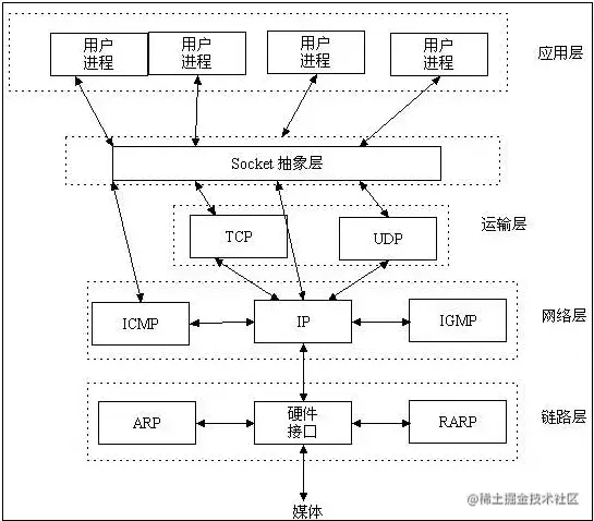 TCP/IP协议族通信的中间软件抽象层,是一个封装了 TCP / IP协议接口(API)从设计模式角度来看,Socket就是一个门面模式,把复杂的TCP/IP协议族隐藏在Socket接口后面,对应用层来说,让Socket去组织数据