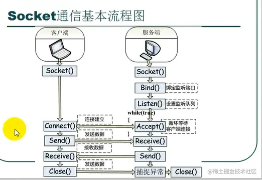 客户端send),服务端接收请求(服务端Receive)并处理请求,然后把回应数据发给客户端(服务端send),客户端读取数据(客户端Receive),最后关闭数据(close),一次交互结束。close方法TCP中就是四次挥手过程