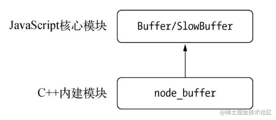 Buffer 是一个 JavaScript 与 C++ 结合的模块,它将性能相关部分用 C++ 实现,将非性能相关的部分用 JavaScript 实现: