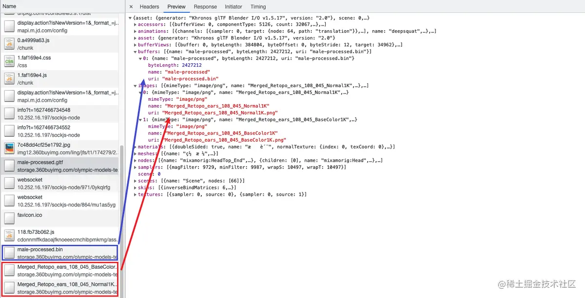 从图中可以看到,当非自包含型的时候,请求glTF文件时,会一同请求图片文件。